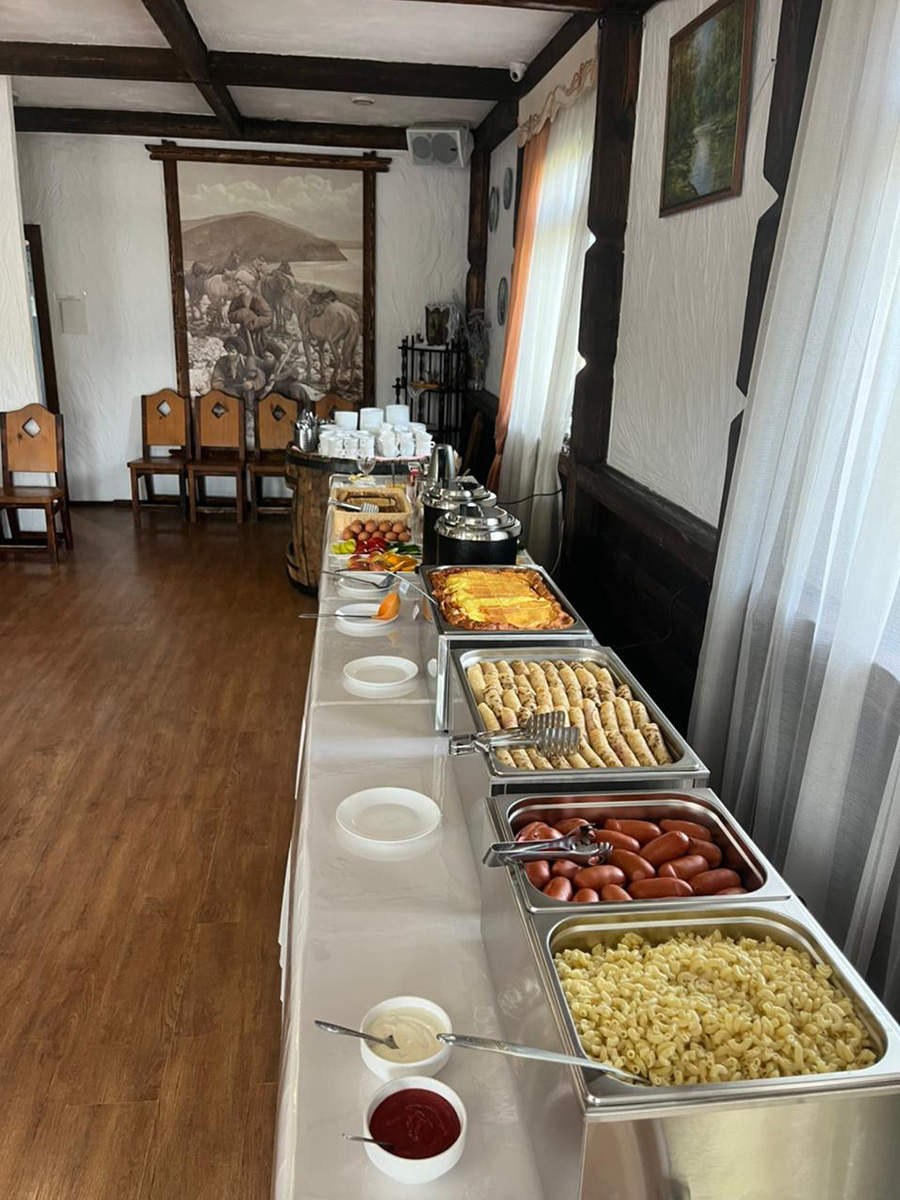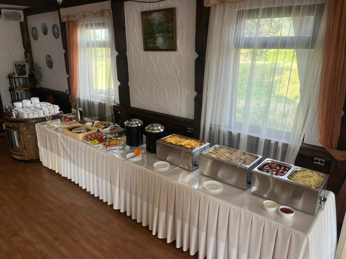 Здесь мы готовим для наших гостей завтрак. Также вы можете заказать обед и ужин. Гости часто бронируют наше кафе для проведения мероприятий - отметить день рождения, провести корпоратив или отгулять свадьбу.