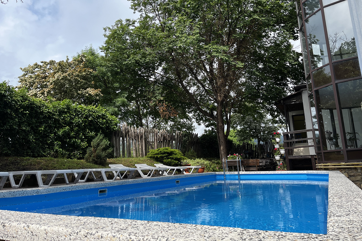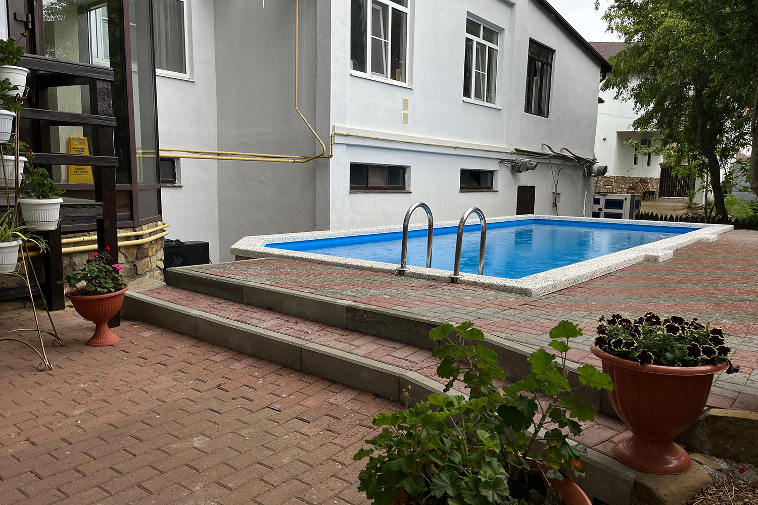 На заднем дворе гостиницы расположен большой открытый бассейн с подогревом. Вдоль бассейна расположена зона лежаков. Тень от крон расположенных рядом деревьев спасает от палящего послеобеденного летнего солнца. Размеры бассейна 5x10 метров, глубина 1,5 метра. Имеется лестница с поручнями.